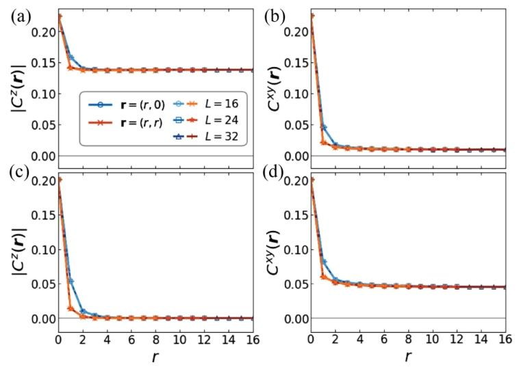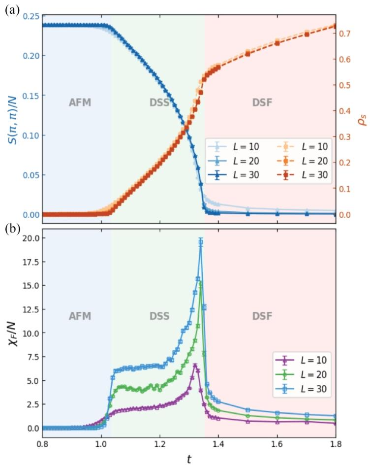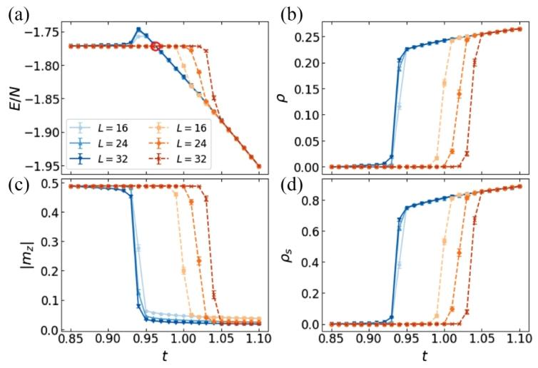 本研究首次在里德堡原子实现的玻色型 t-J-V 模型中预言了双超固体相的存在,揭示了长程相互作用、空穴隧穿与自旋关联共同作用下的新奇量子序。本研究通过大规模量子蒙特卡洛(QMC)模拟,首次系统揭示了里德伯原子阵列实现的玻色型 t-J-V 模型的丰富基态相图,核心成果在于发现了新颖的双超固体(DSS)相。该相图在强空穴 – 空穴排斥作用(V≥3.0)下形成,介于反铁磁(AFM)绝缘相与双超流(DSF)相之间,其本质是晶格对称性与两个 U (1) 对称性(空穴数守恒、总磁化强度守恒)的同时自发破缺,表现为面外反铁磁序、面内铁磁序与空穴超流性的共存。研究还证实了 DSS 相的热稳定性,其在低温区间(T<0.5)保持序参量稳定,且出现独特的 “热补偿有序” 现象 —— 在 T≤0.5 范围内,自旋结构因子随温度升高而增强,这一 counterintuitive 特性源于空穴局域化导致的自旋 – 自旋关联强化。此外,明确了 AFM 相与 DSF 相间为一级相变,DSS 相与 DSF 相间为连续相变,为实验验证提供了清晰的相变判据。