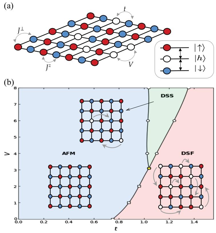 科学家通过大规模量子蒙特卡洛(QMC)模拟,系统研究了二维方形晶格上玻色型 t-J-V 模型的基态相图及有限温度特性。模型哈密顿量包含三部分:空穴隧穿项(t,与距离三次方成反比)、自旋 – 自旋相互作用项(Jz、J⊥,与距离六次方成反比)和空穴 – 空穴排斥项(V,与距离六次方成反比),并满足局域硬核约束(每个格点仅允许一个自旋或空穴占据),守恒空穴数和总磁化强度两个 U (1) 对称性。模拟采用随机级数展开(SSE)结合定向回路算法,通过退火技术克服小隧穿强度下的采样效率问题,在 L×L 晶格(L=10-40)上探究 t-V 参数空间的相图结构,并通过有限温度模拟分析双超固体相的热稳定性。